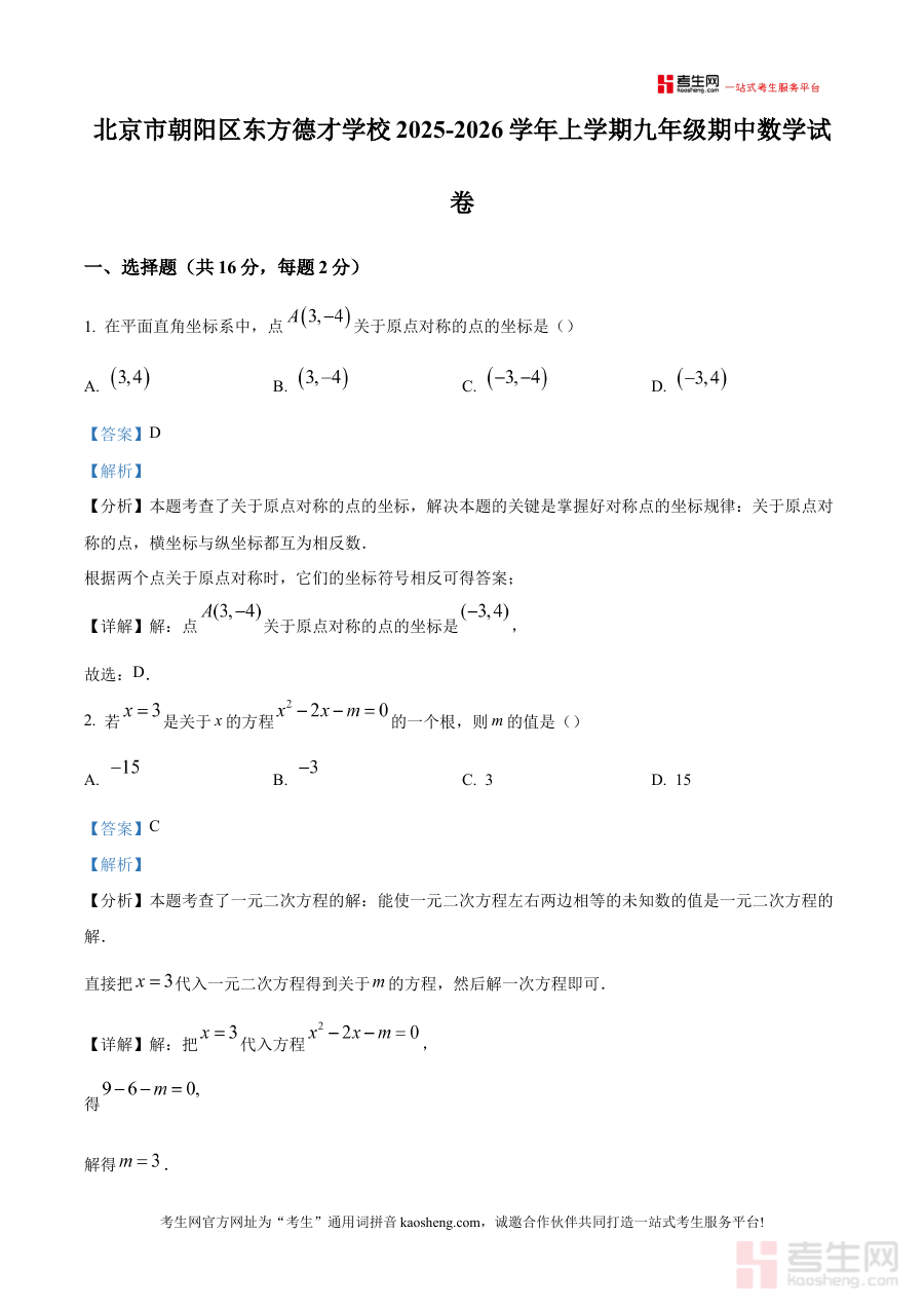 《精品解析:北京市朝阳区东方德才学校2025-2026学年上学期九年级期中数学试卷(解析版)》是针对北京市朝阳区东方德才学校2025-2026学年上学期九年级期中数学考试的专项备考资料,聚焦该阶段数学学科的期中检测需求,为使用者提供贴合学校教学进度与考试标准的参考内容。