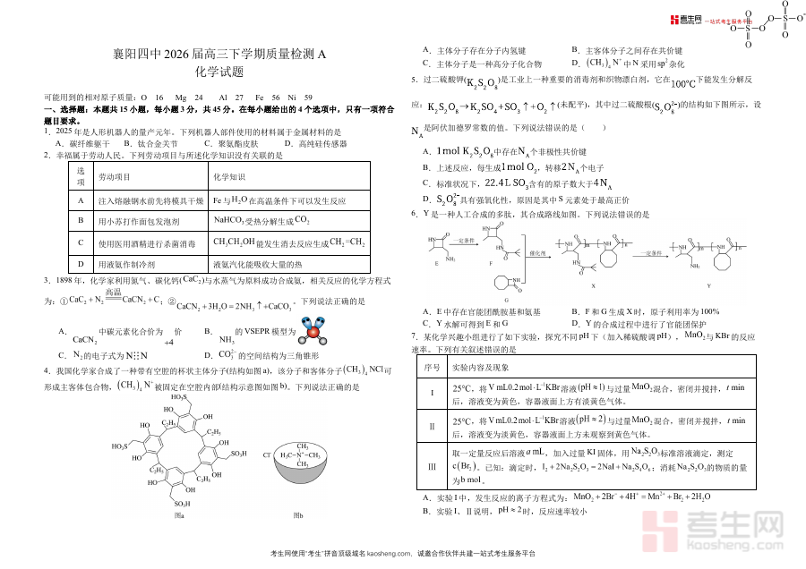 《襄阳四中2026届高三下学期质量检测 化学+答案》是湖北省襄阳市第四中学针对2026届高三学生在学期末阶段推出的化学学科质量检测资料,包含检测试题与对应参考答案两部分。该资料聚焦高三下学期这一高考备考的关键冲刺期,以标准化检测为载体,旨在客观反映学生当前化学学科的知识掌握水平与应用能力,为后续复习提供数据支撑。