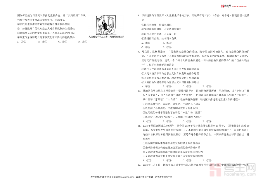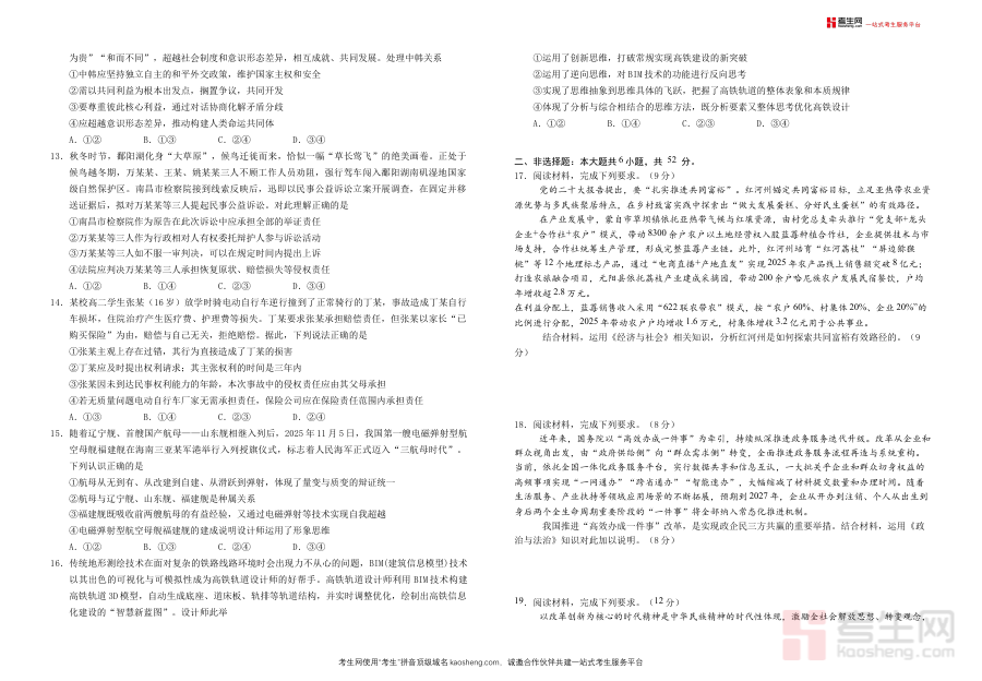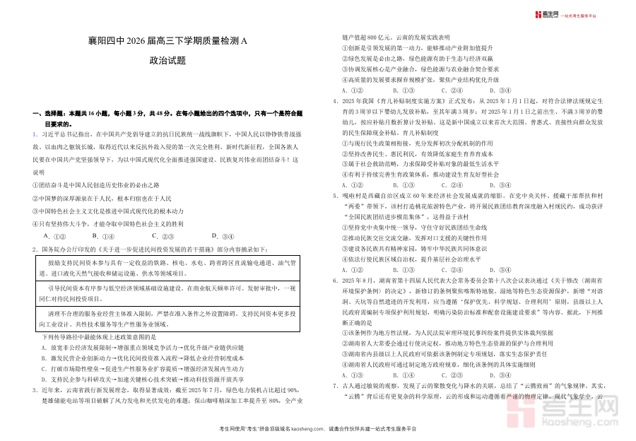 《襄阳四中2026届高三下学期质量检测 政治+答案》是湖北省襄阳市第四中学为2026届高三学生设计的政治学科阶段性质量检测资料,包含检测试题及对应参考答案。作为高三下学期关键备考阶段的核心材料之一,它紧密贴合该年级学生的学习进度与备考需求,能够直接反映学生在政治学科上的当前知识掌握程度与学习状态,为后续备考提供基础依据。
