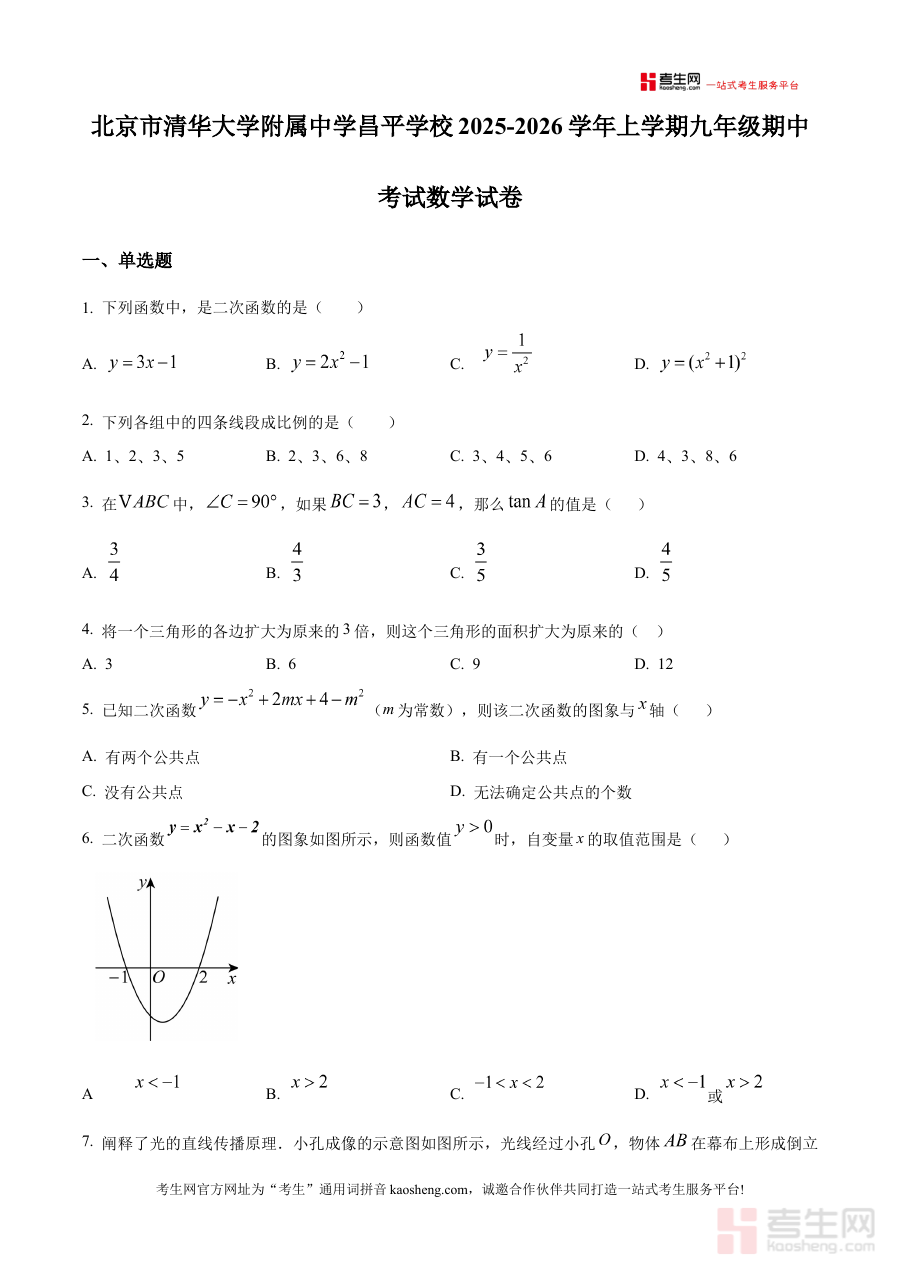 此资料适用于北京市清华大学附属中学昌平学校2025-2026学年上学期的九年级学生、数学教师及学生家长,其原卷版内容能切实支撑阶段学习效果的评估,为后续备考规划提供真实考试样本参考,提升期中复习的针对性与有效性。