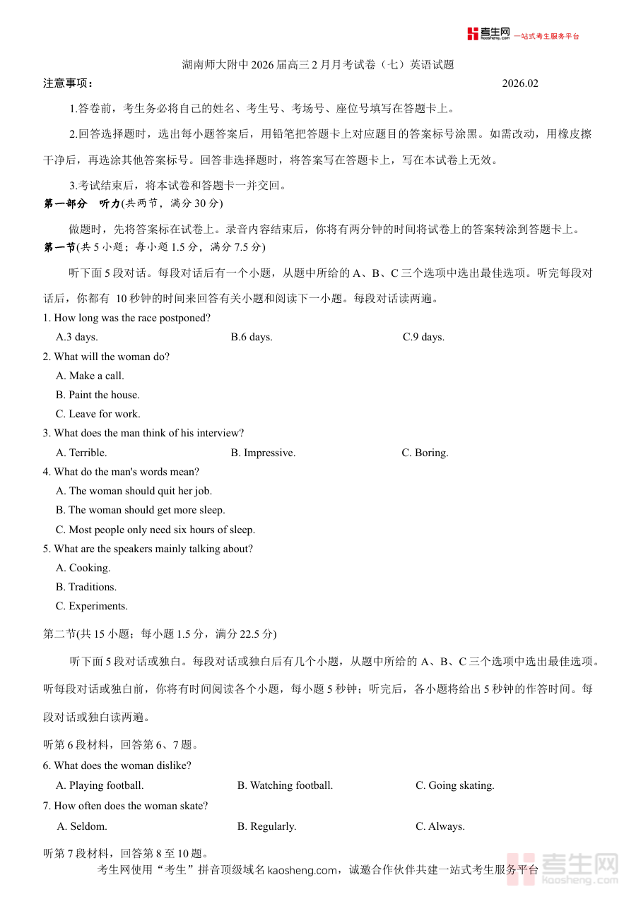 《湖南师大附中2026届高三2月月考试卷(七)英语试题(含解析,含听力原文无音频)》是湖南省湖南师大附中针对2026届高三学生设计的阶段性英语测试资料,属于该校高三年级第七次月度检测的英语学科内容。作为高三备考过程中的重要阶段性资料,它紧密结合该校高三英语教学进度与学生学习实际情况,为学生提供了符合本校教学节奏的标准化检测机会。