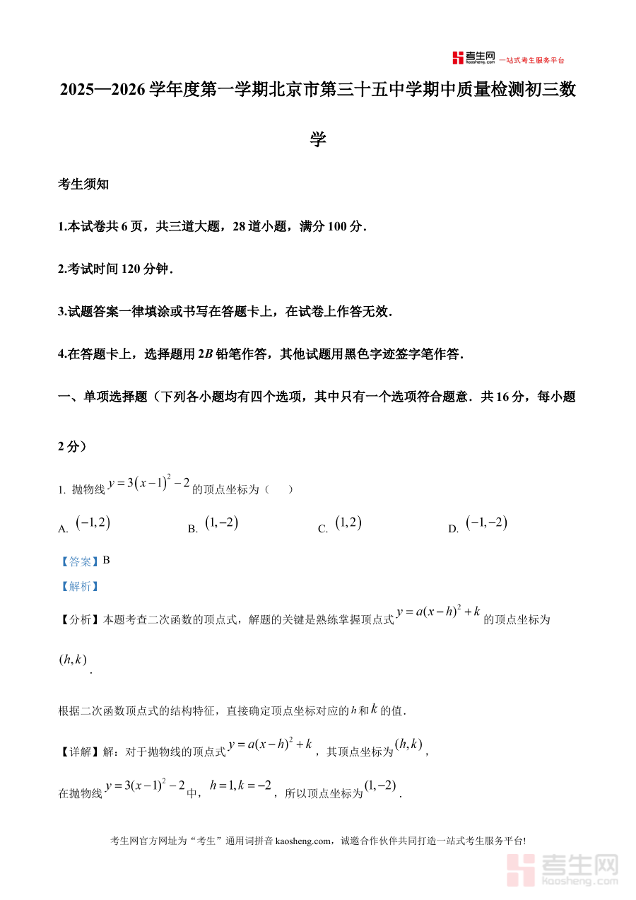 该资料主要适用于北京市第三十五中学2025至2026学年的九年级学生对于他们而言这份解析版试卷不仅是期中备考的重要辅助材料还能通过解析部分深入理解解题思路与方法强化对知识点的应用能力同时也可为教师提供参考素材辅助教师了解学生可能存在的共性问题以优化教学策略或为家长提供了解孩子学习状况的有效途径共同助力学生的数学学习与期中备考
