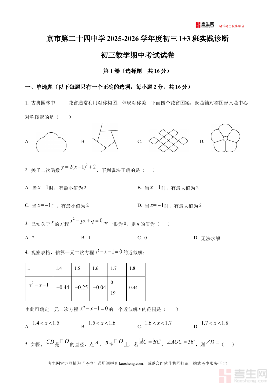 《精品解析:北京市第二十四中学2025~2026学年上学期九年级期中数学试卷(原卷版)》是针对北京市第二十四中学2025至2026学年上学期九年级期中数学考试的备考资料,紧密贴合该校该阶段数学教学进度与期中考查要求,为学生提供与校考实际高度匹配的练习资源。