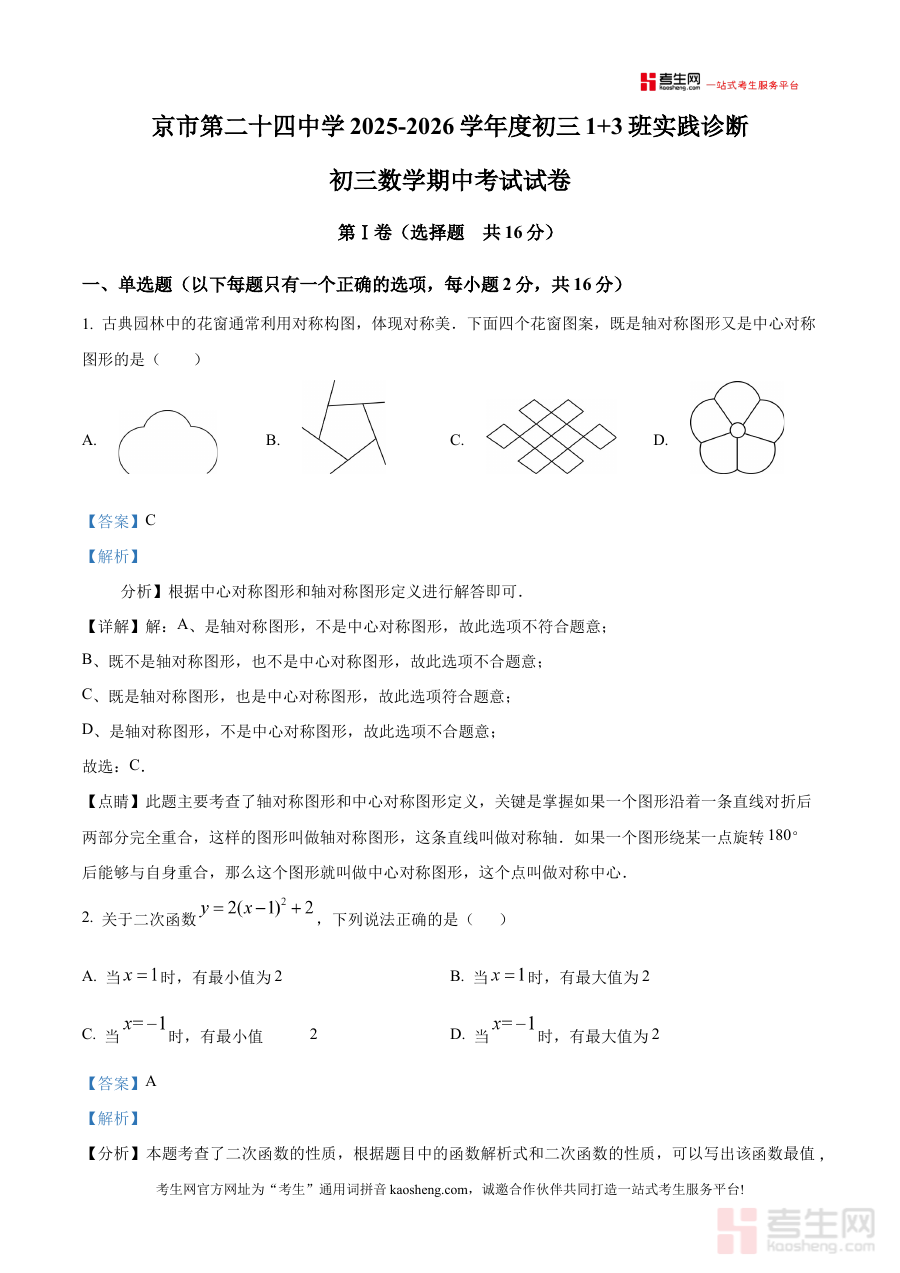 本资料主要适用于北京市第二十四中学该学年的九年级学生,通过对本校期中试卷的详细解析,帮助学生熟悉考试题型与考查方向,提升阶段检测的应对能力,对优化期中备考策略、巩固阶段性数学知识具有显著的实用价值。
