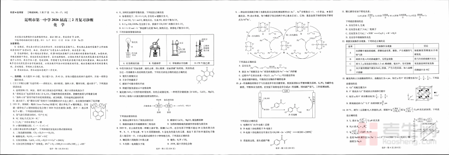 《昆明市第一中学2026届高三2月复习诊断 化学》是昆明市第一中学针对2026届高三学生在2月复习阶段推出的化学学科诊断资料。作为当地教育领域具有较高权威性的学校,昆明一中组织的诊断考试通常与高三复习进度深度契合,2月这一时间节点处于高三上学期复习收尾与下学期系统强化的过渡阶段,该资料旨在为学生提供贴合当前复习节奏的阶段性评估依据,是高三化学备考过程中具有参考价值的阶段性学习资源。