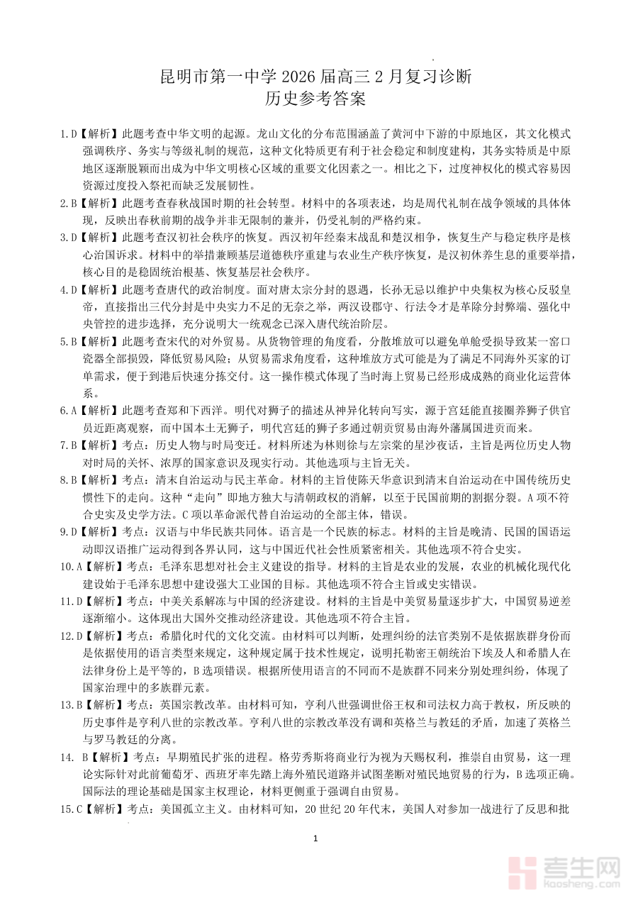 《昆明市第一中学2026届高三2月复习诊断 历史答案》是针对昆明市第一中学2026届高三学生2月复习诊断考试的历史学科配套答案资料。该资料关联的考试属于高三阶段的阶段性复习诊断类考试,旨在通过特定时间节点的检测,帮助师生把握历史学科的复习进度与知识掌握情况。它作为考试的重要组成部分,为考生和教师提供了明确的作答参考与评分依据,是衔接前期复习与后续备考调整的关键载体。