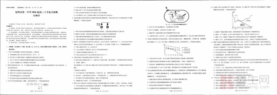 《昆明市第一中学2026届高三2月复习诊断 生物》是昆明市第一中学针对其2026届高三学生在2月份开展的生物学科阶段性复习诊断资料。该资料紧密围绕高三学年上半学期末至下学期初的复习进度设置,契合高考生物备考的阶段性目标与学校自身教学规划,旨在对学生前一阶段生物知识掌握情况进行全面评估与反馈。作为区域性重点中学推出的诊断资料,它既体现了昆明地区高三生物复习的共性要求,也融入了该校在生物学科教学中的特色经验,为学生提供了贴合自身学习实际的检测载体。