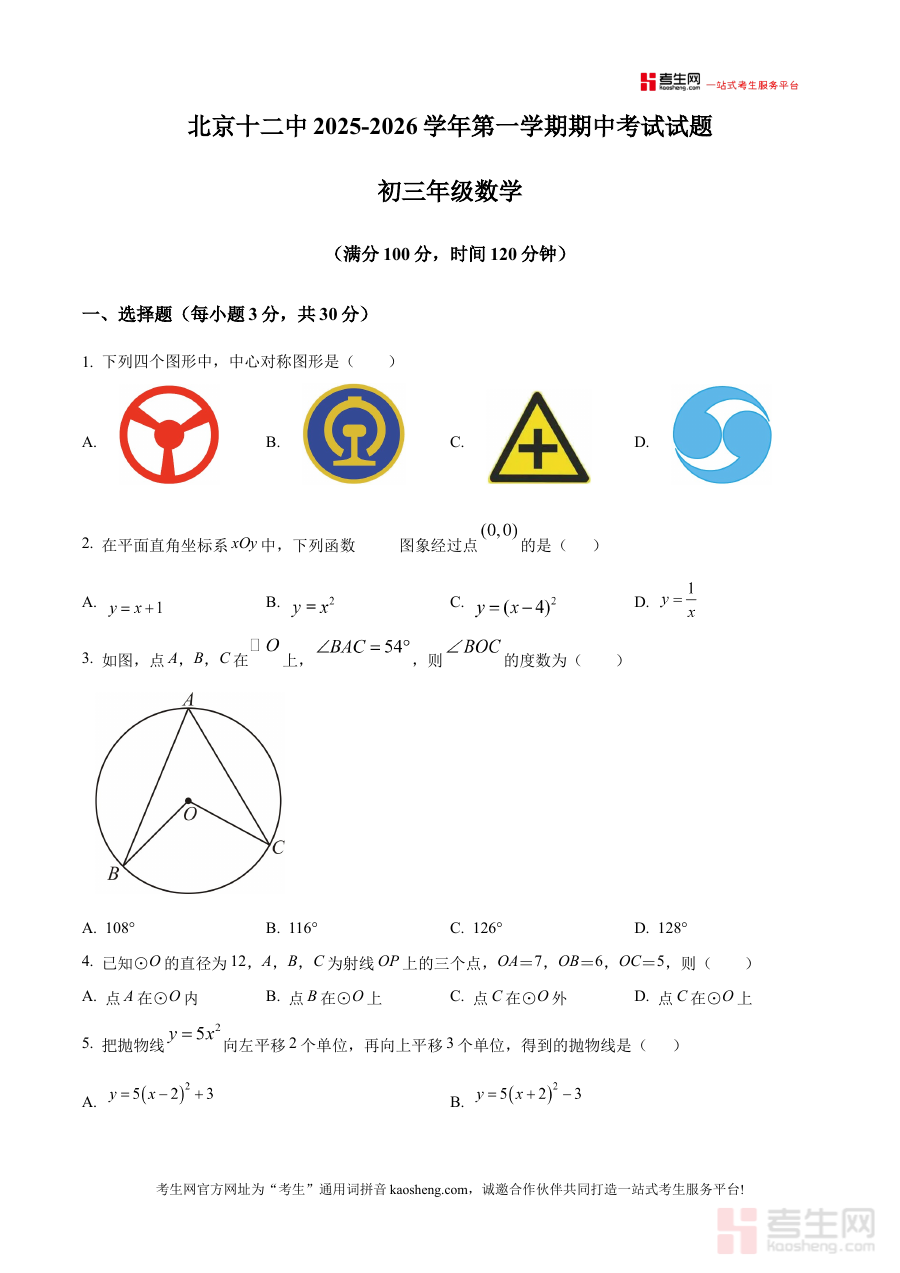 《精品解析:北京市第十二中学2025-2026学年九年级上学期期中数学试题(原卷版)》是针对北京市第十二中学2025至2026学年九年级上学期期中数学考试的专属备考资料,精准匹配该校该阶段数学学科的期中检测场景,为相关使用者提供贴合校考实际的资源支撑。