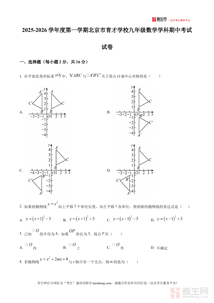 《精品解析:北京市育才学校2025-2026学年九年级上学期期中数学试题(原卷版)》是面向北京市育才学校特定学年九年级学生推出的期中数学考试备考资料,紧密贴合该学年上学期的数学教学进度与校内期中检测要求,为师生提供了与校内考试直接对应的原卷形式资源,有助于使用者快速把握期中数学考试的核心方向与考查框架,是阶段性学习成果检测与备考准备的重要参考。