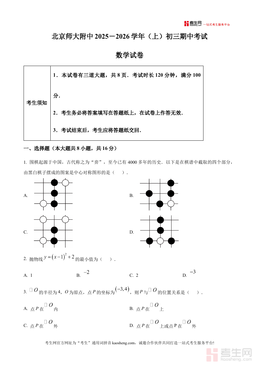 《精品解析:北京师范大学附属中学 2025-2026学年上学期九年级期中数学试卷 (原卷版)》是针对北京地区北师大附属中学2025-2026学年上学期九年级期中阶段数学考试的专属备考资料,紧密贴合该学校九年级上学期期中数学考试的时间节点与阶段学习进度,为学生提供与校内考试直接相关的原卷资源支持。