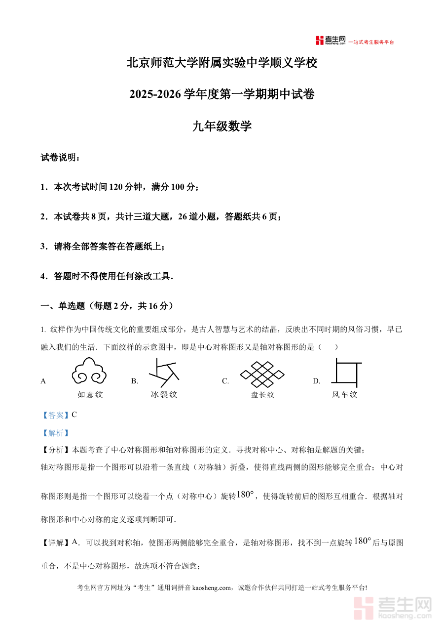《精品解析:北京师范大学附属实验中学顺义学校2025-2026学年上学期九年级期中考试数学试卷(解析版)》是针对北京地区北京师范大学附属实验中学顺义学校2025-2026学年上学期九年级数学期中考试的专业备考资料,聚焦该阶段数学学科的期中检测需求,为相关师生提供精准的解析支持。