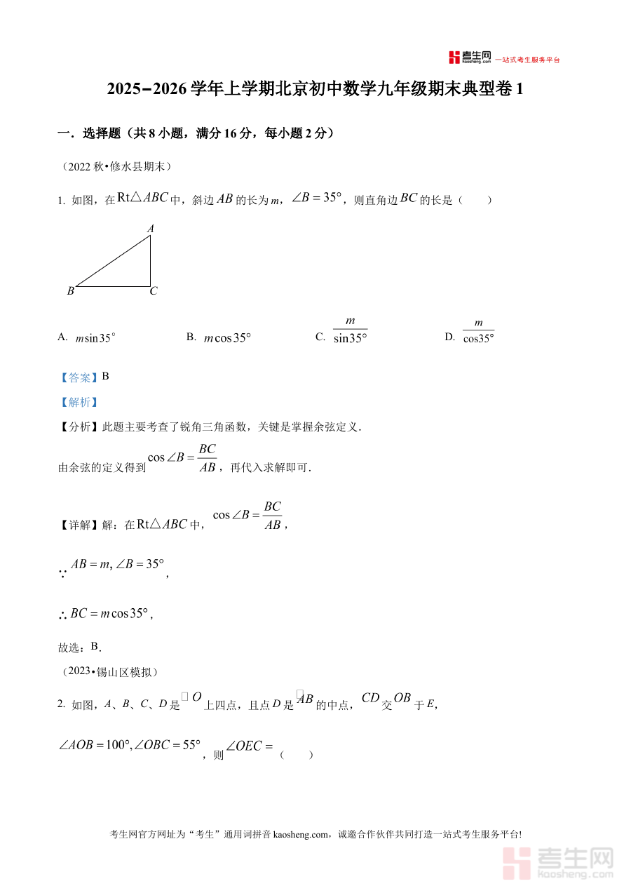 《精品解析:北京市2025-2026学年上学期初中数学九年级期末典型卷1(解析版)》是针对北京市2025-2026学年上学期初中九年级数学期末考试的备考资料,聚焦该地区该学年九年级上学期期末这一特定阶段的数学考试需求,为相关使用者提供具有针对性的内容支持。