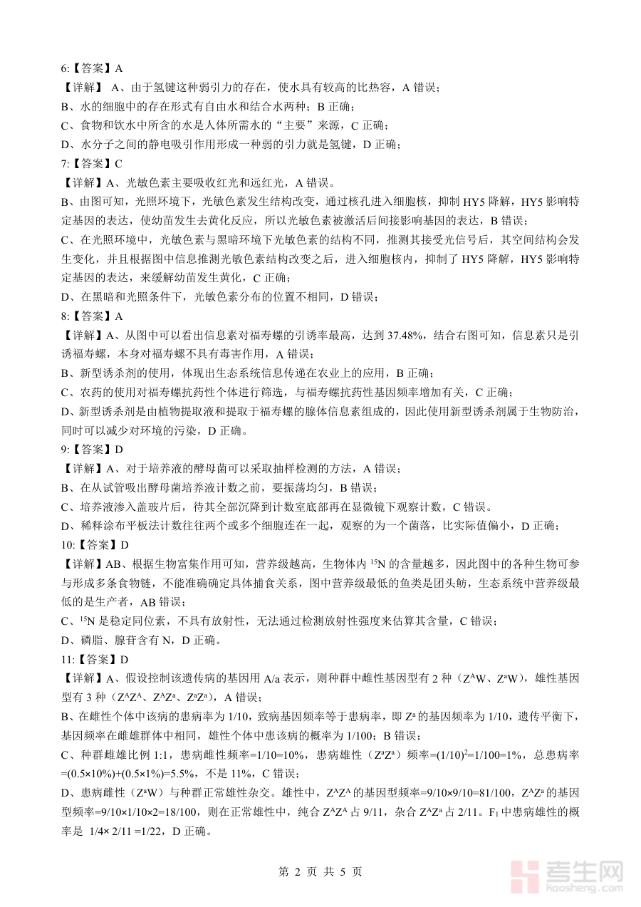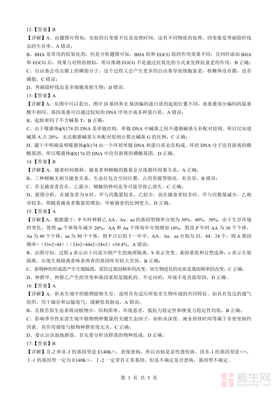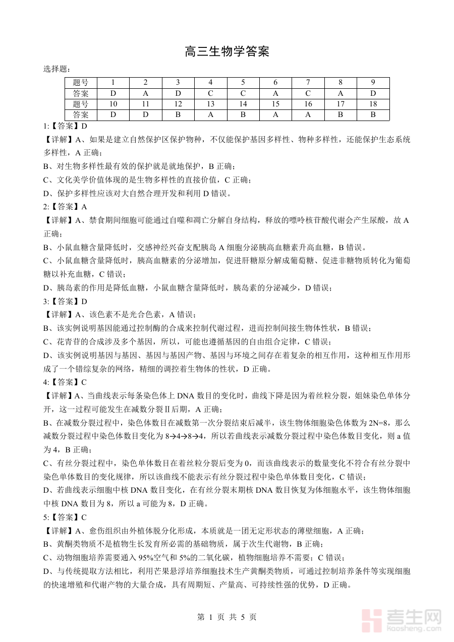 此答案资料主要用于辅助考生核对自身答题结果,帮助其快速了解作答准确性;同时可为教师提供客观评分标准与答题情况分析基础,助力教师诊断学生在生物学科知识掌握与应用层面的实际状况,为后续教学与复习计划调整提供数据支持。