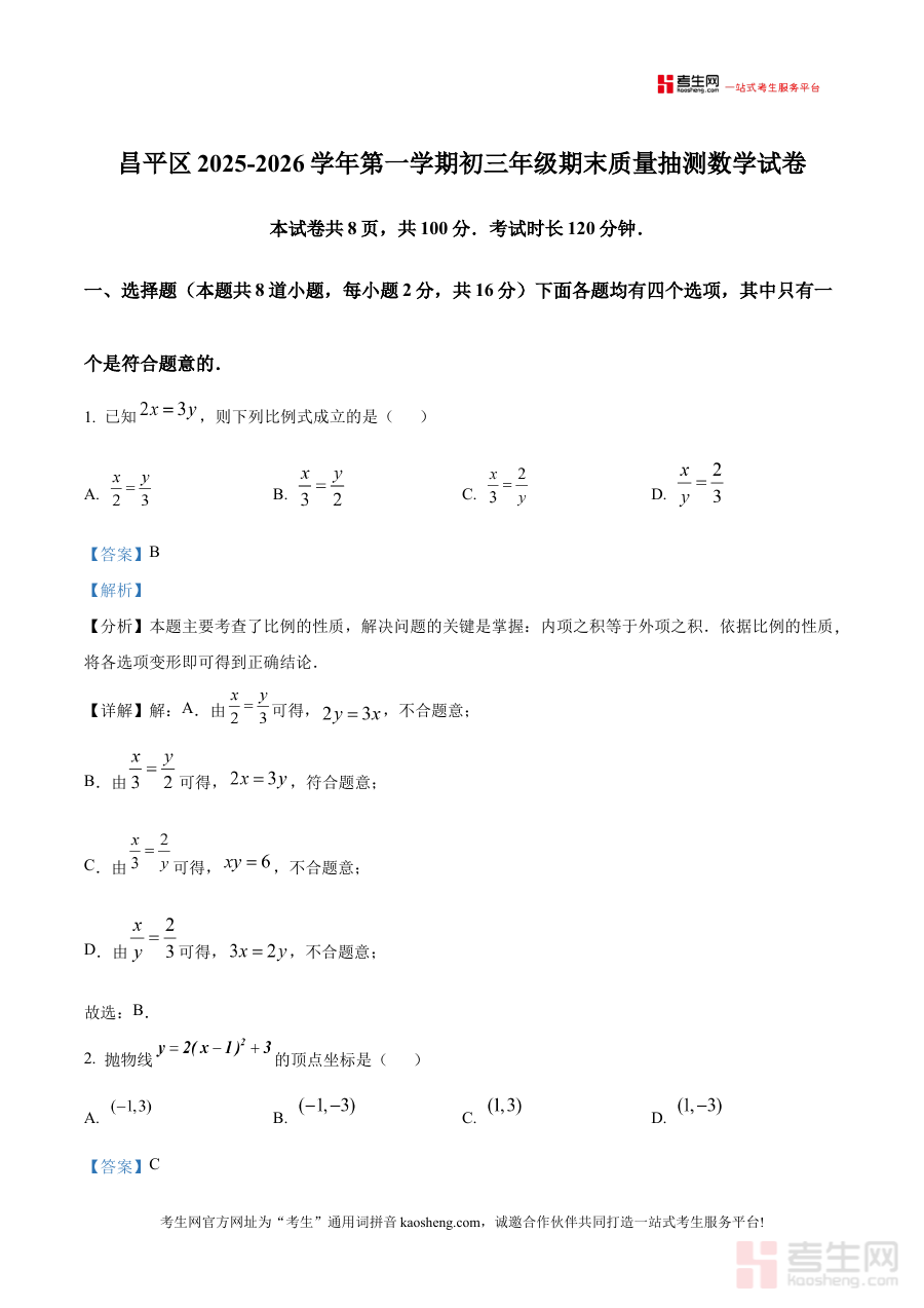 《精品解析:北京市昌平区2025-2026学年上学期九年级期末质量抽测 数学试题(解析版)》是针对北京市昌平区2025-2026学年上学期九年级期末质量抽测数学科目的专业备考资料,紧密贴合该地区九年级上学期数学阶段学习目标与期末检测要求,为使用者提供精准的复习方向与支持,帮助其更好地应对即将到来的期末质量抽测。
