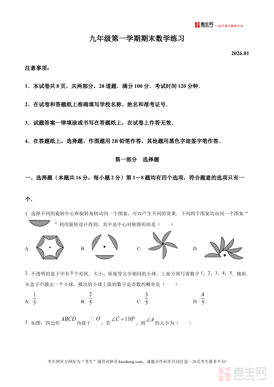 《精品解析:北京市海淀区2025-2026学年九年级上学期期末考试数学试题(原卷版)》是针对北京市海淀区2025至2026学年九年级上学期数学期末考试的备考资料,精准对应该地区该学段的期末检测场景,为使用者提供与考试直接关联的原卷内容参考。