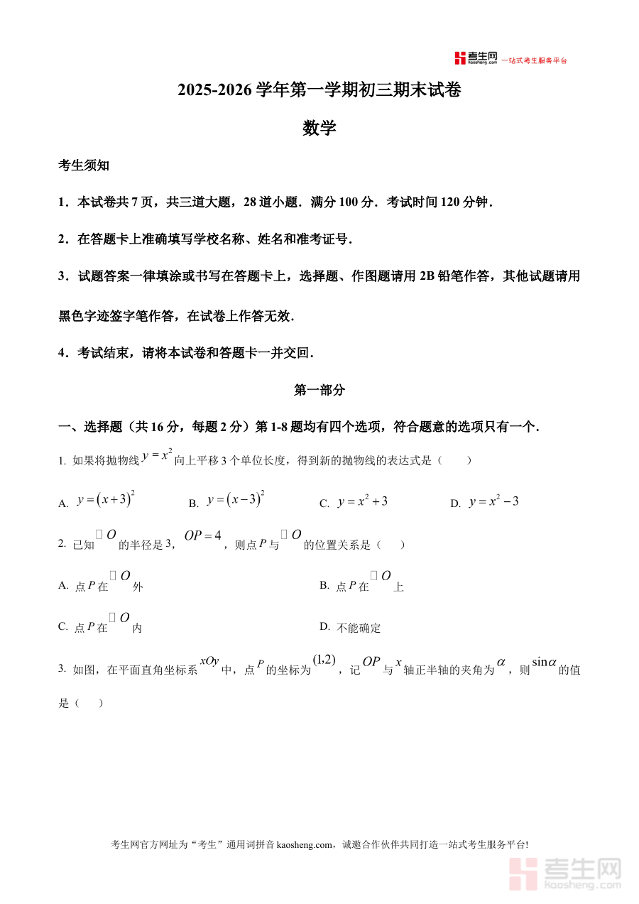 《精品解析:北京市石景山区2025-2026学年上学期九年级期末数学试题(原卷版)》是针对北京市石景山区2025-2026学年上学期九年级学生设计的期末数学考试原卷资料,属于该阶段数学学科的核心备考资源,精准匹配当地九年级数学期末考查的范围与方向。