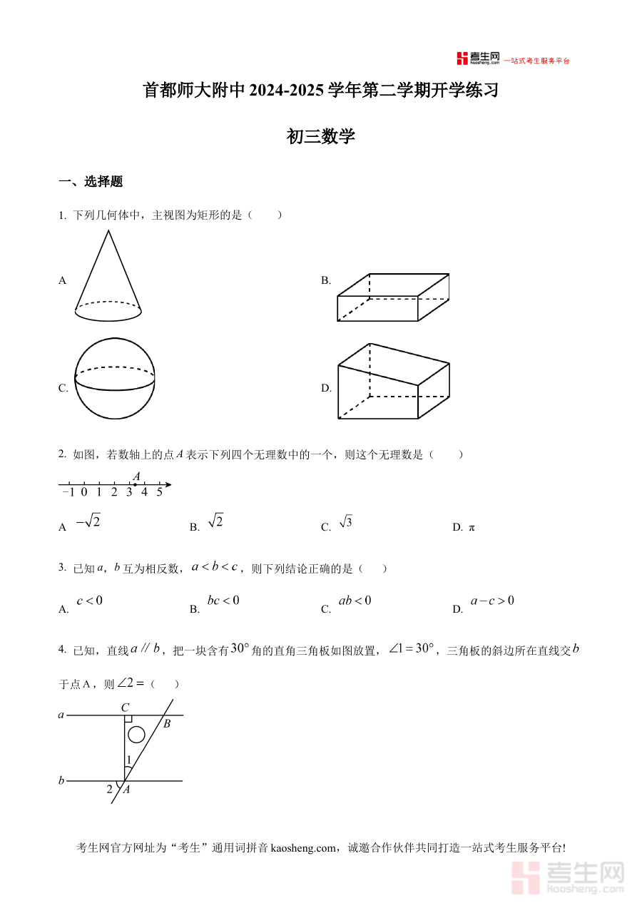 该资料主要适用于北京首都师范大学附属中学2024—2025学年下学期的九年级学生,用于开学前或初期的自我检测与备考准备;也可供其他同类学校同年级学生参考使用,帮助熟悉开学考考查形式与难度;对于数学教师而言,还可作为教学参考辅助设计开学阶段检测内容与计划。其核心价值在于提供真实校考情境练习,助力高效开展阶段学习评估与备考规划。