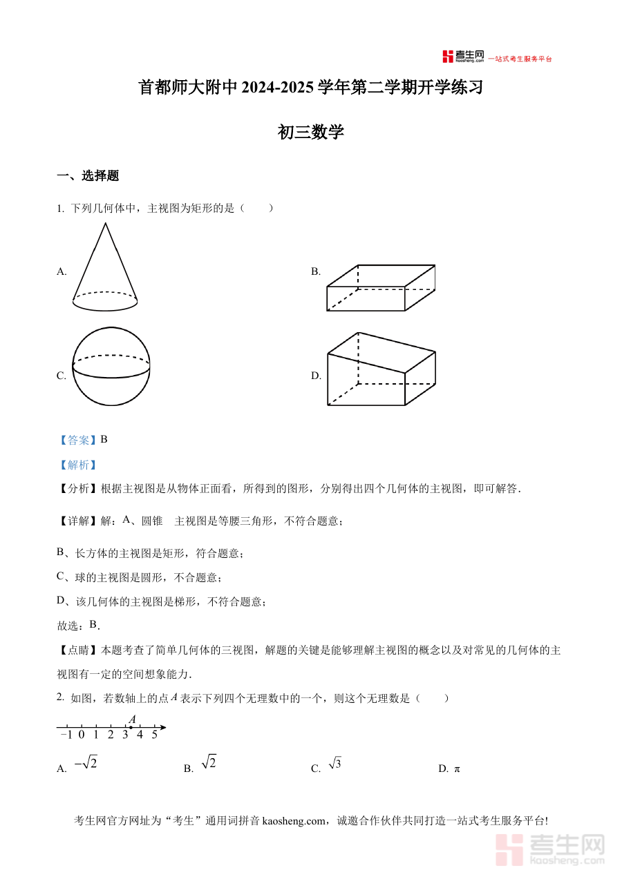 本资料适用于北京首都师范大学附属中学及周边同类学校的九年级学生、数学教师等群体,通过提供开学考数学试题的详细解析,帮助学生强化阶段知识巩固,协助教师优化教学策略与备考指导,充分发挥阶段检测在学习进程中的反馈与引导作用。