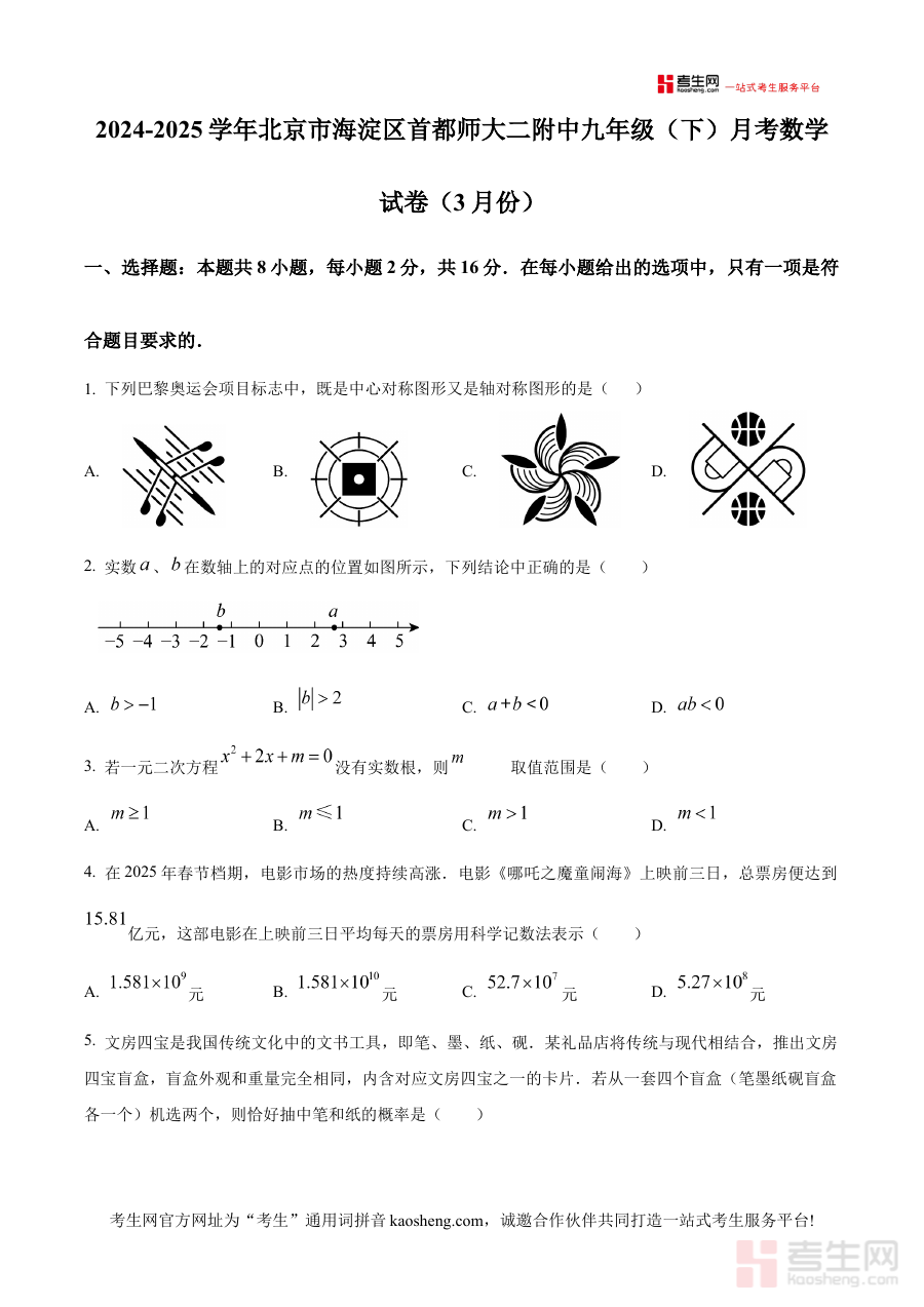 《精品解析:北京市海淀区首都师大二附中2024-2025学年九年级下学期月考数学试卷(3月份) (原卷版)》是针对北京市海淀区首都师大二附中2024-2025学年九年级下学期3月份数学月考的专属备考资料,精准匹配该校该阶段数学教学的阶段性考查需求,为学生提供与校考实际高度契合的练习资源。