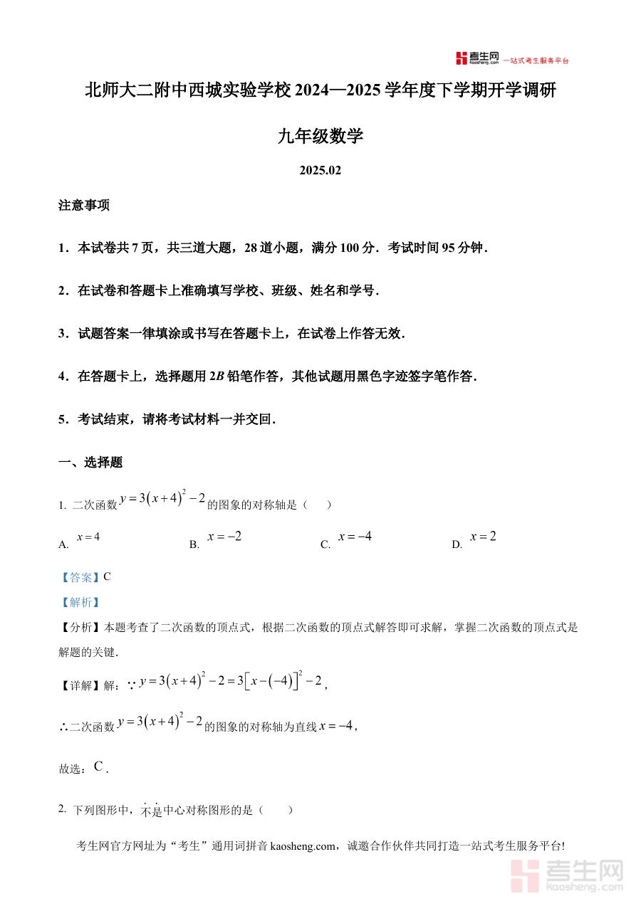 《精品解析:北京市 西城区北京师范大学第二附属中学西城实验学校 2024-2025学年九年级下学期数学开学测试题(解析版)》是针对北京市西城区北京师范大学第二附属中学西城实验学校2024-2025学年九年级下学期数学开学测试的专项备考资料,精准匹配该阶段的检测场景与学科需求,为相关使用者提供专业的解析服务。