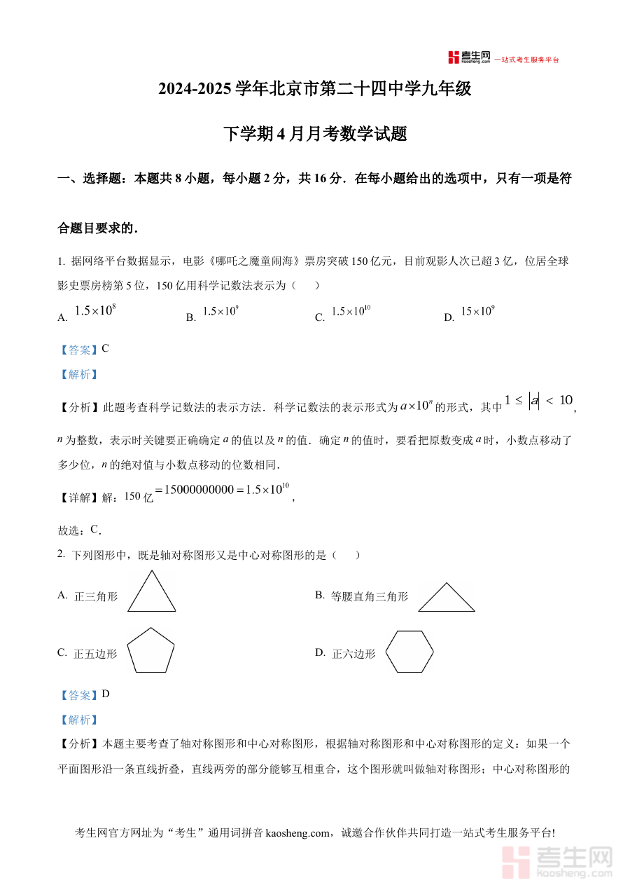 《精品解析:北京市第二十四中学2024-2025学年九年级下学期4月月考数学试题(解析版)》是针对北京市第二十四中学2024-2025学年九年级下学期4月数学月考的配套解析资料,聚焦该阶段数学学科的阶段性检测需求,为相关使用者提供与校内考试直接关联的备考支持资源。