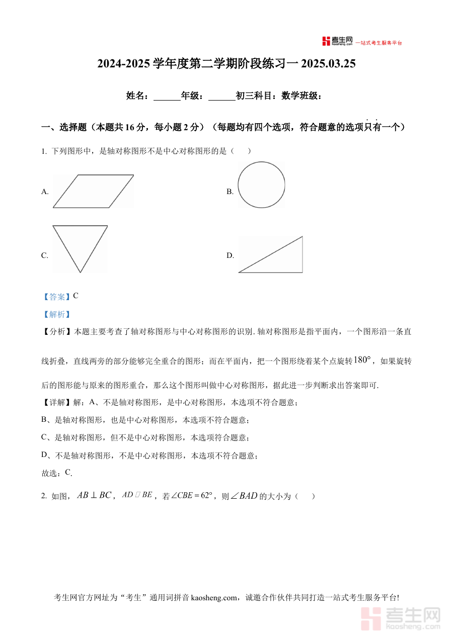 《精品解析:北京市第八中学2024-2025学年九年级下学期3月月考数学试题(解析版)》是针对北京市第八中学2024至2025学年九年级下学期3月举行的数学月考所编制的配套解析资料,精准贴合该阶段的教学进度与考试安排,为学生提供与实际考试场景高度匹配的备考支持。