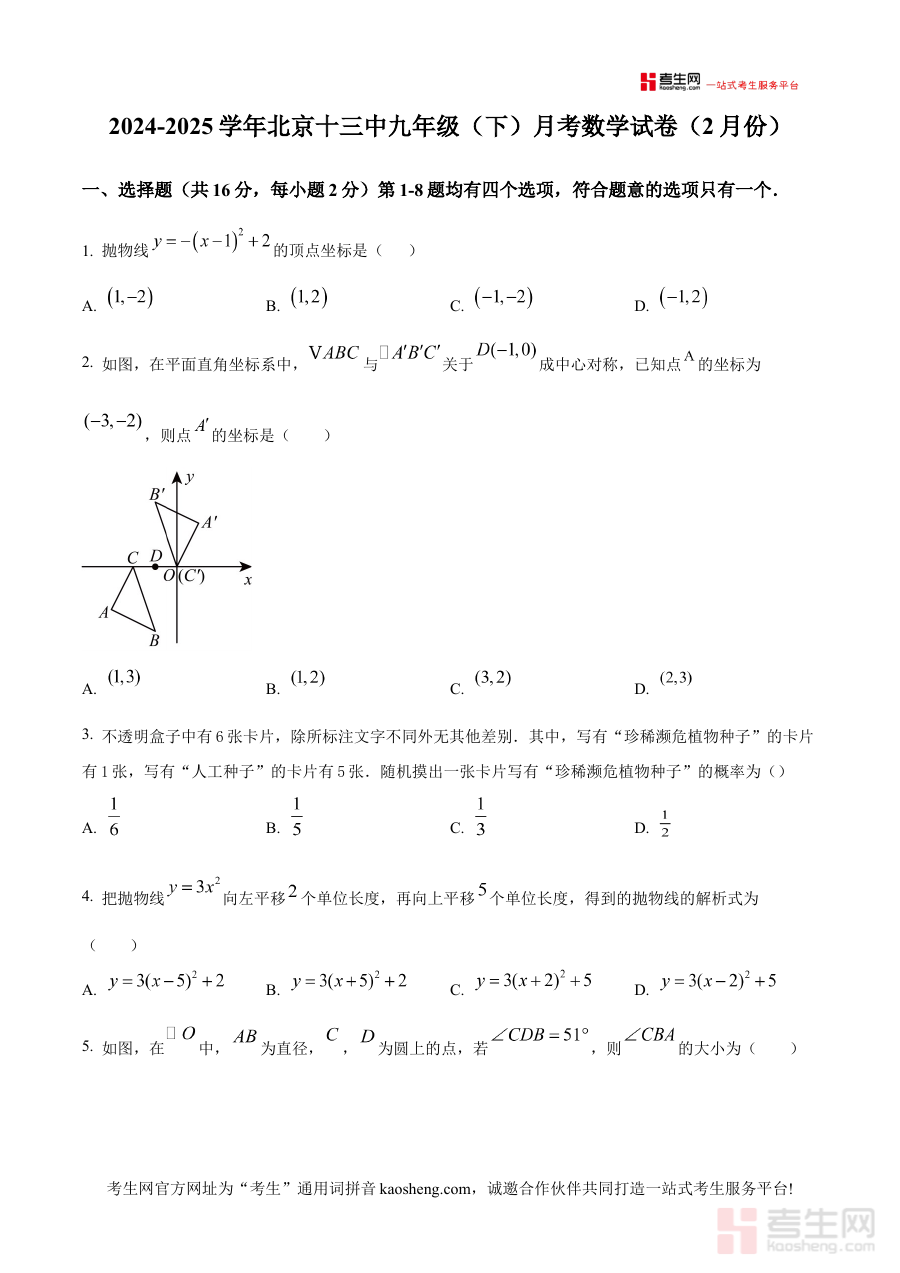 本资料适用于北京市第十三中学九年级学生、数学教师及相关教辅人员,其作为该学校特定阶段的测试原卷,能够有效支持学生的阶段检测需求和教师的教学评估工作,对提升学习与备考的针对性、优化学习规划具有重要参考价值。