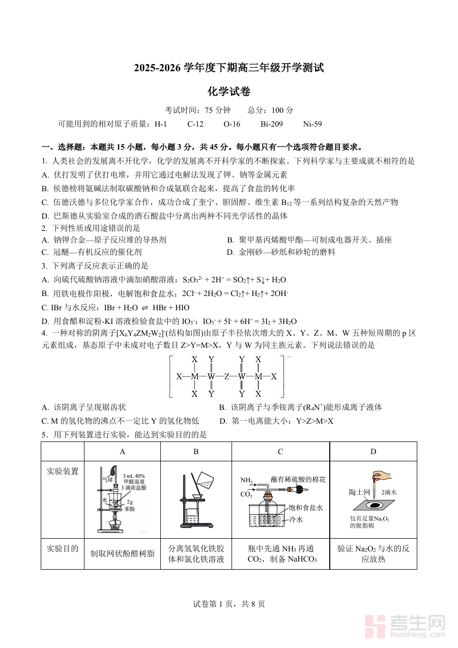 该资料适用人群主要为成都市第七中学高2026届学生,他们可借助这份资料进行开学考试备考准备,提升应对考试的信心与能力。此外,对于其他同年级同阶段高中学生而言,这份来自重点中学的开学考试资料也具参考价值,能帮助他们了解开学阶段化学学科检测重点,提前做好学习规划,为新学期化学学习奠定良好基础,实现知识有效衔接与巩固。
