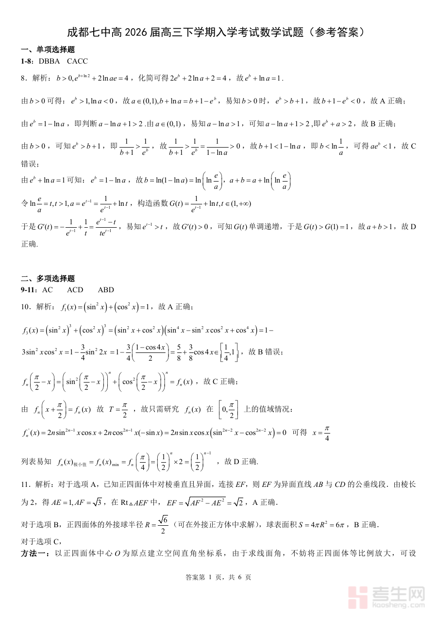 《成都市第七中学2025—2026学年度下期高2026届开学考试 数学答案》是成都市第七中学针对高2026届学生在2025-2026学年度下期开学阶段数学考试编制的配套答案资料,属于区域性中学阶段性考试的辅助资源,为该考试的备考与后续学习提供直接参考依据。