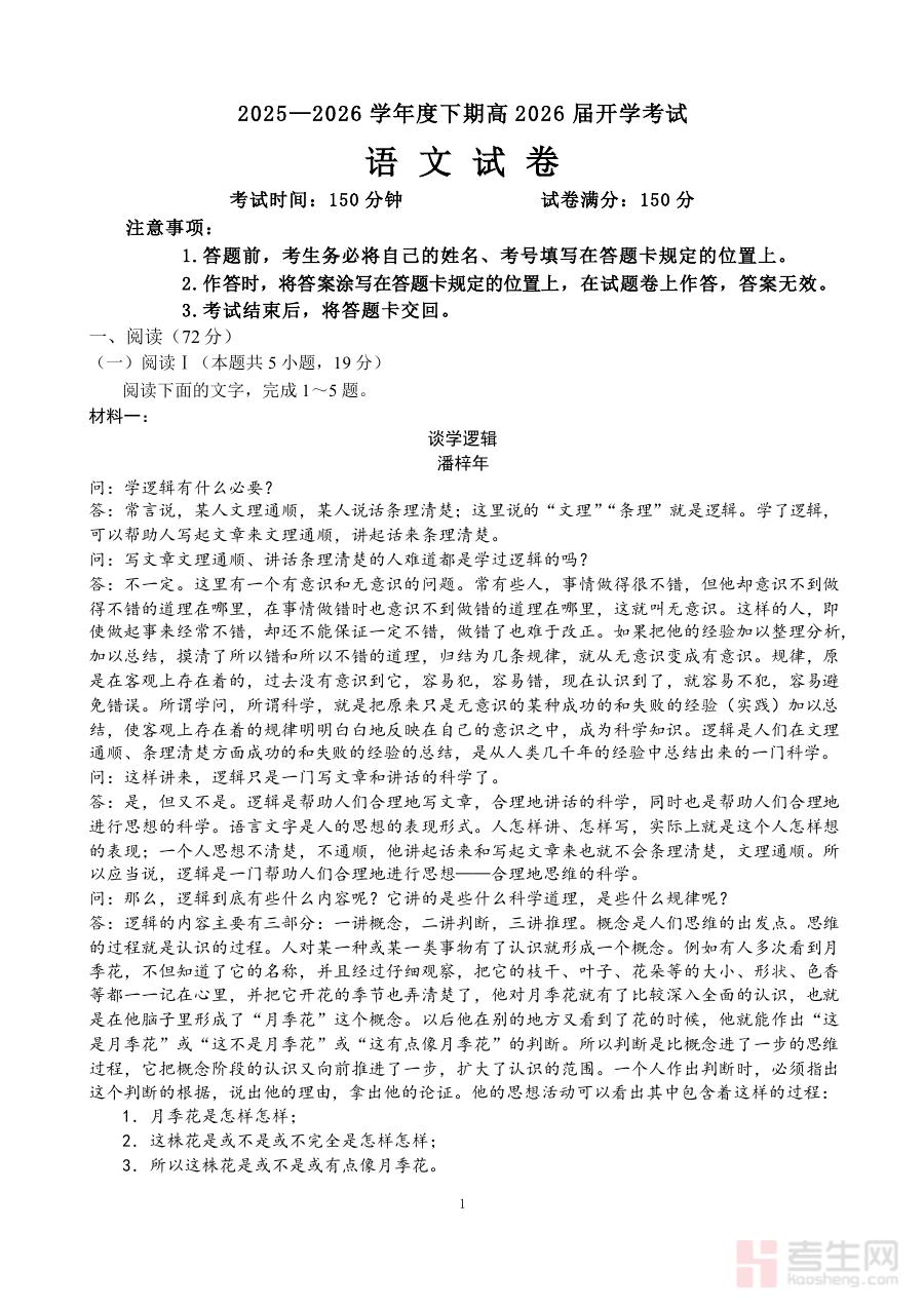 《成都市第七中学2025—2026学年度下期高2026届开学考试 语文》是成都市第七中学针对高2026届学生在2025至2026学年度下学期开学初期组织的语文考试相关备考资料。该资料紧密结合学校新学期教学安排,聚焦开学阶段对学生语文综合能力的检测需求,为师生提供与本次考试直接关联的参考内容,帮助双方快速进入新学期的教学与学习状态,是衔接上学期学习成果与新学期教学目标的重要载体。