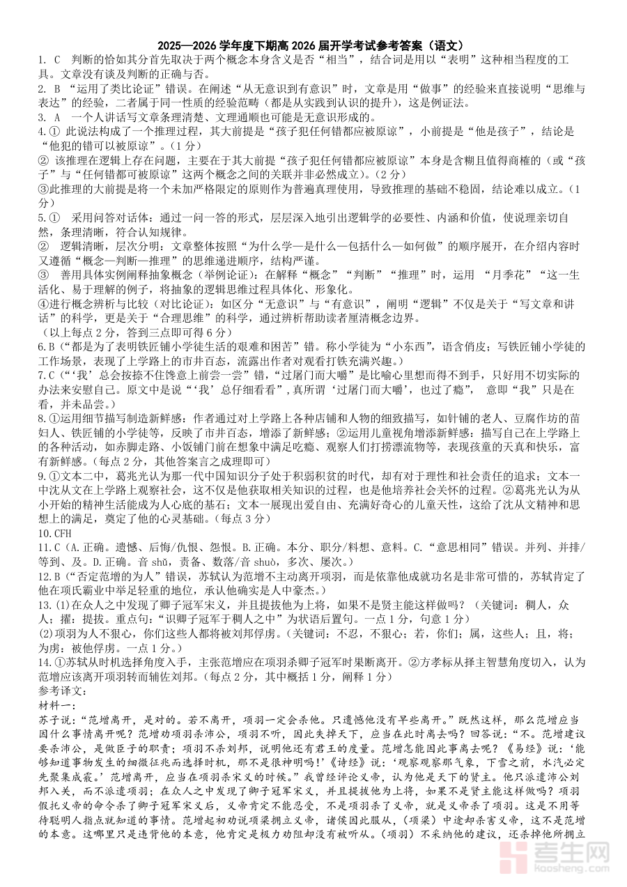 《成都市第七中学2025—2026学年度下期高2026届开学考试 语文答案》是针对成都市第七中学高2026届学生在2025-2026学年度下期开学阶段语文考试的配套答案资料。该资料与同期同校同年级的开学考试直接对应,为学生和教师提供了该次考试的标准解答参考,是相关群体了解考试结果、校验答题情况的重要依据。