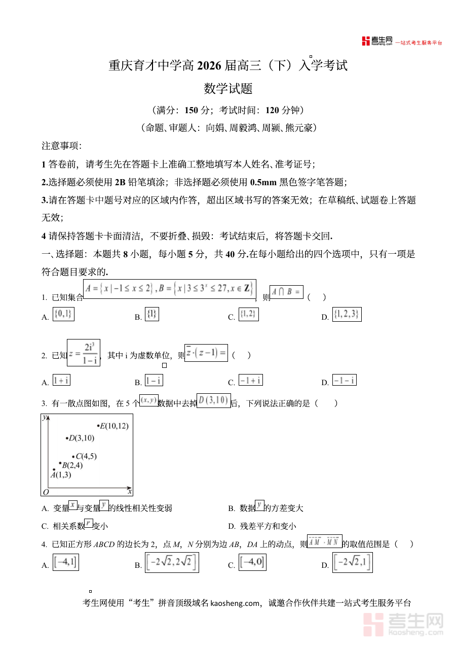 该资料主要适用于重庆市育才中学校2026届高三学生,也可为同地区其他学校的高三学生提供阶段检测的参考样本,其核心价值在于通过贴合本校教学实际的试题内容,助力学生进行针对性的阶段检测与备考规划,帮助学生在高三关键阶段找准学习定位,提升备考效率与学习效果,为高考冲刺做好前期准备。
