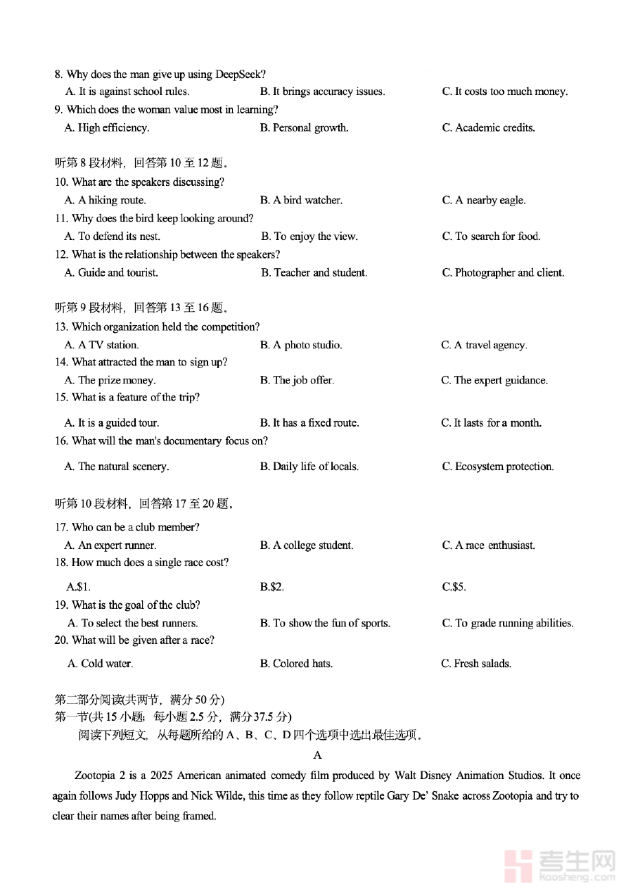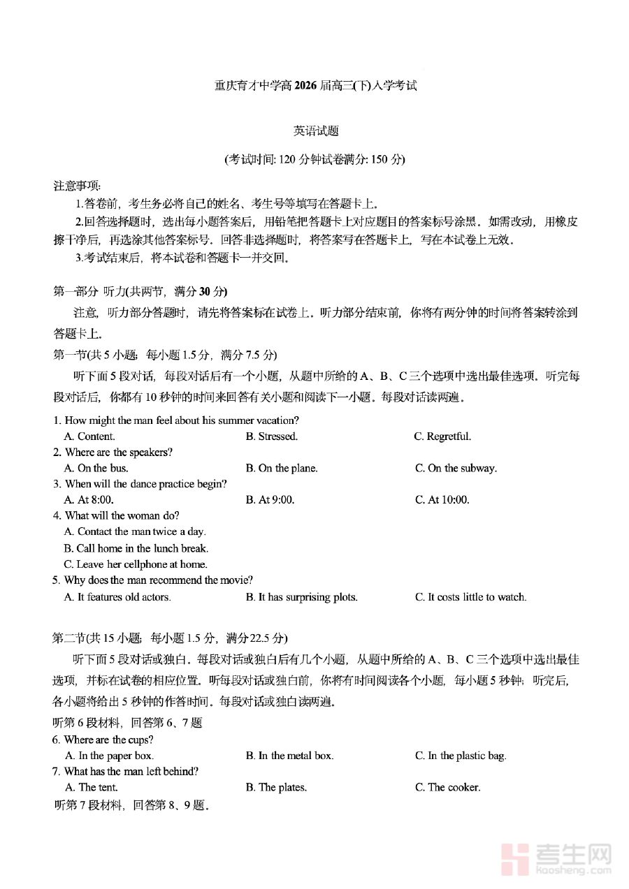 本试题主要适用于2026届重庆市育才中学高三下学期的学生群体,通过使用该试题进行练习或参与对应考试,学生能够提前熟悉入学考试的题型结构与考查重点,强化英语学科核心素养的运用能力;同时也可为该校英语教师开展针对性教学、调整教学策略提供参考依据,有效提升备考阶段的教学质量与效率。