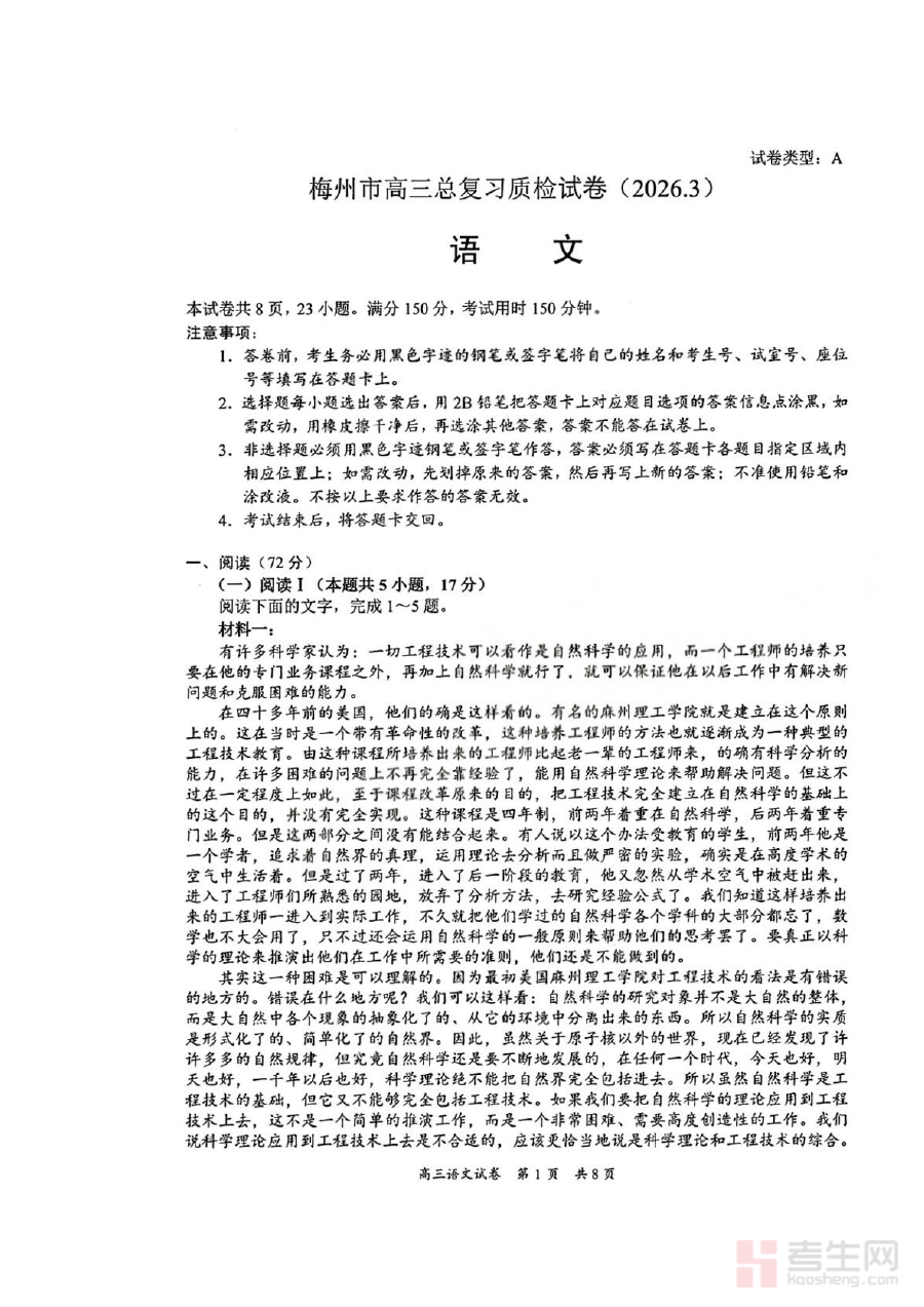 该试题主要适用于2026届广东省梅州市的高三学生及语文教师群体。对于学生而言,它是进行自我评估、查缺补漏的重要载体,有助于提前熟悉高考的考试节奏、题型结构和答题要求;对于教师而言,它能为教学诊断、学情分析和备考规划提供可靠依据,助力提升复习教学的效率和质量。此外,教育教研人员也可通过该试题了解梅州市高三语文备考的阶段性特点,为区域教学研究和资源开发提供参考。