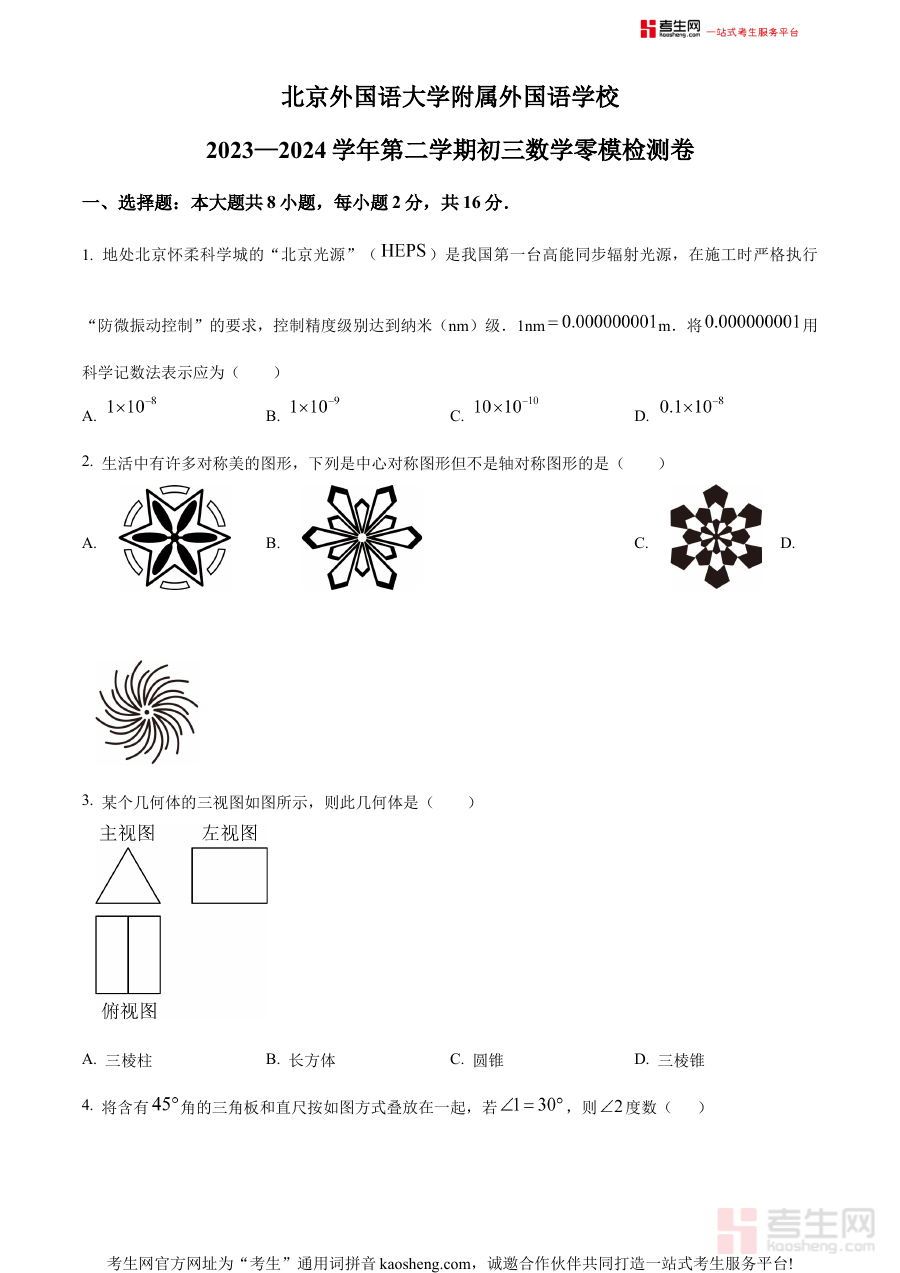 《精品解析:2024年北京外国语大学附属外国语学校中考零模数学试题(原卷版)》是2024年面向北京地区中考考生推出的数学备考资料,由北京外国语大学附属外国语学校提供,聚焦中考零模这一中考前期关键阶段性考试环节,呈现了贴合本地考情的数学试题原卷内容,为考生开展中考初期备考提供了与实际考试场景高度契合的参考资源。
