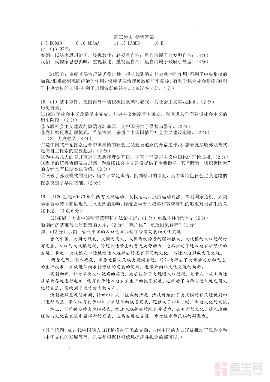 此资料可用于考生对零模考试历史学科作答情况的自我校验与分析,帮助学生明确自身在历史知识掌握、解题思路运用等方面的优势与不足,同时也为教师开展后续教学调整与备考指导提供数据支撑,助力优化阶段复习策略。