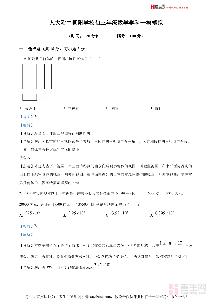 《精品解析:2024年北京市中国人民大学附属中学朝阳学校中考一模数学试题(解析版)》是针对2024年北京市初中毕业生学业水平考试的阶段性模拟检测资料,由中国人民大学附属中学朝阳学校命制,紧密贴合北京中考数学学科的命题方向与考查要求,为考生提供具有区域代表性和学校特色的实战练习资源,是中考前重要的备考辅助材料。