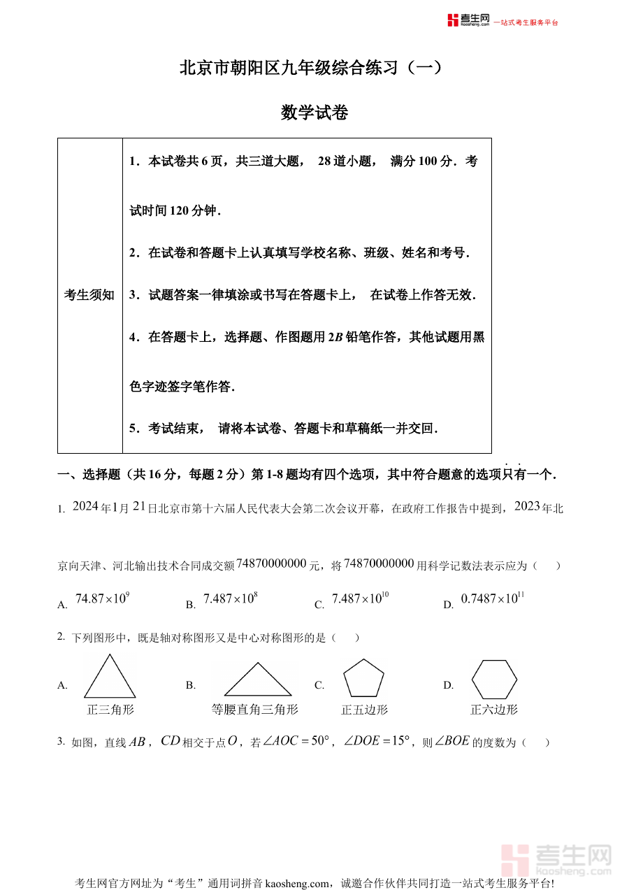 《精品解析:2024年北京市朝阳区九年级中考一模数学试题(原卷版)》是针对2024年北京市朝阳区区域内九年级学生设计的中考前阶段性模拟考试数学科目的原卷资料,精准贴合该地区当年中考数学的命题方向与区域教学实际情况,为学生提供了与真实一模考试场景高度一致的试题呈现形式,是中考备考过程中具有区域针对性的重要资源之一。