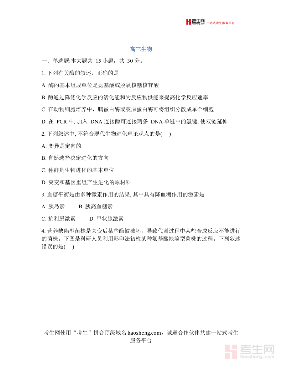 该资料可用于高三学生在开学初期进行生物学科的学情诊断,帮助师生明确开学前阶段的知识掌握情况,为后续的备考规划提供数据参考,同时也能作为开学后调整学习策略与教学重点的依据。