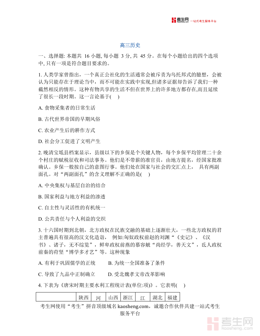该资料可用于高三学生在开学初期进行历史学科的学情诊断,帮助学生快速掌握自身假期后对历史知识的掌握程度,同时为教师提供阶段教学效果的参考,辅助制定后续针对性的教学与备考规划,明确开学阶段的学习重点与提升方向。