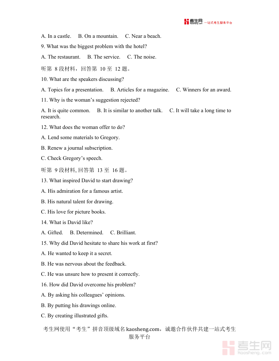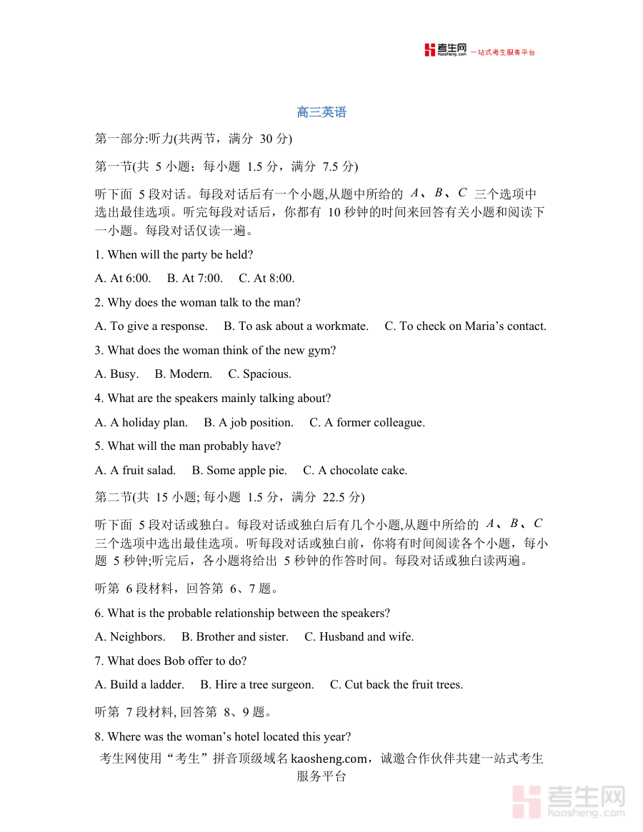 此试卷及配套答案可用于高三学生在开学初期开展自我学情诊断,帮助师生准确把握新学期开始时学生的英语学习现状;同时能为教师制定后续教学计划、学生调整备考策略提供数据参考,助力实现更具针对性的教学与复习安排。
