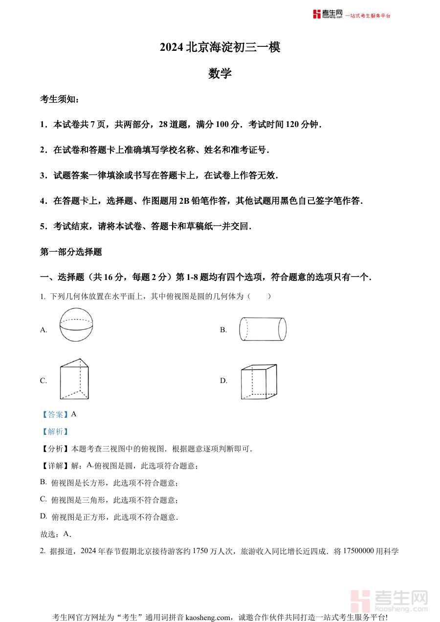 《精品解析:2024年北京市海淀区九年级中考一模数学试题(解析版)》是2024年北京市海淀区针对九年级学生推出的中考一模数学试题配套解析资料,属于中考前重要的阶段性备考资源,旨在帮助使用者把握该地区中考一模数学考试的命题趋势与考查重点,为后续的中考复习提供清晰方向。