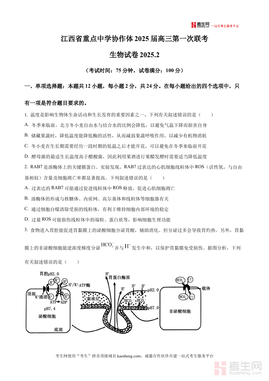 《江西省重点中学协作体2026届高三第一次联考生物试卷(含答案)》是面向江西省重点中学协作体成员校2026届高三学生的阶段性联考生物学科资料,聚焦高三初期生物学科知识掌握情况与能力水平检测需求。该资料依托江西省重点中学协作体的联考体系,能够反映区域内重点中学高三生物教学的阶段性成果与学生整体学习状况,为后续备考提供基础参照依据。