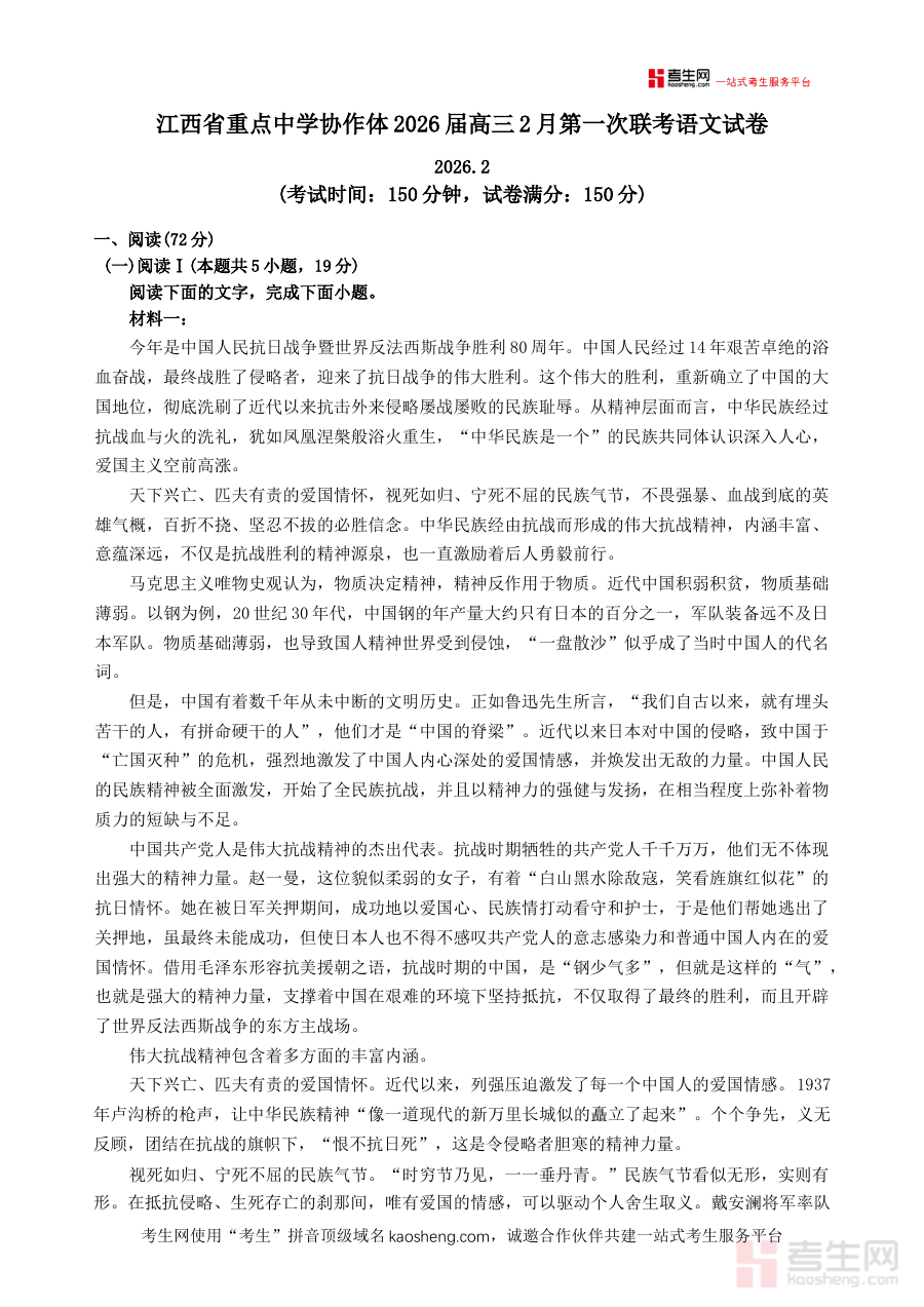 本资料的适用人群主要为江西省重点中学协作体2026届高三学生,以及负责该届学生语文教学的教师。对于学生而言,它是高三初始阶段进行自我检测、明确备考重点的重要工具;对于教师而言,它能为教学评估与备考规划提供真实可靠的参考依据,助力师生共同把握复习节奏,提升语文备考的效率与质量。