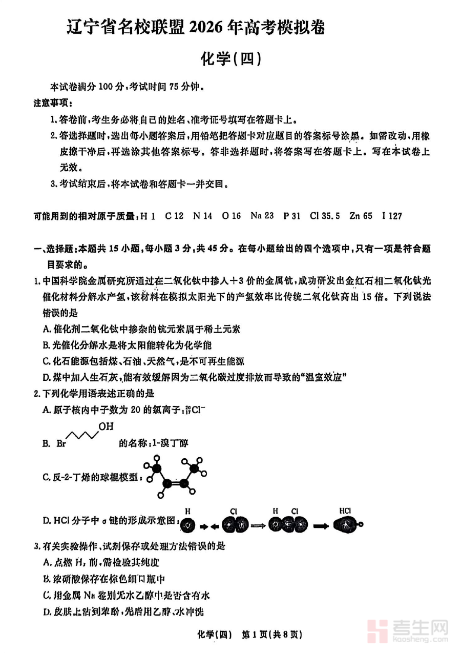 《辽宁省名校联盟2026年高考模拟卷化学四(含答案)》是辽宁省名校联盟针对2026年普通高等学校招生全国统一考试化学科目编制的第四套模拟试卷,包含完整答案解析部分。作为高考化学备考体系中的重要资料,它依托辽宁省名校联盟优质教学资源与命题经验,紧密围绕高考化学考查方向与核心要求设计,为考生提供贴近高考实际场景的训练载体。