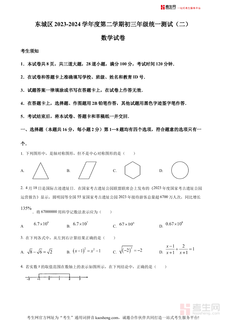 《精品解析:2024年北京市东城区中考二模数学试题(原卷版)》是针对2024年北京市东城区初中毕业生的中考第二次模拟考试数学科目的备考资料,其原卷版形式完整还原了当地中考二模的考试结构与呈现方式,为使用者提供了贴近真实考试场景的参考载体,有助于使用者直观了解该区域中考二模数学考试的整体框架与命题方向。