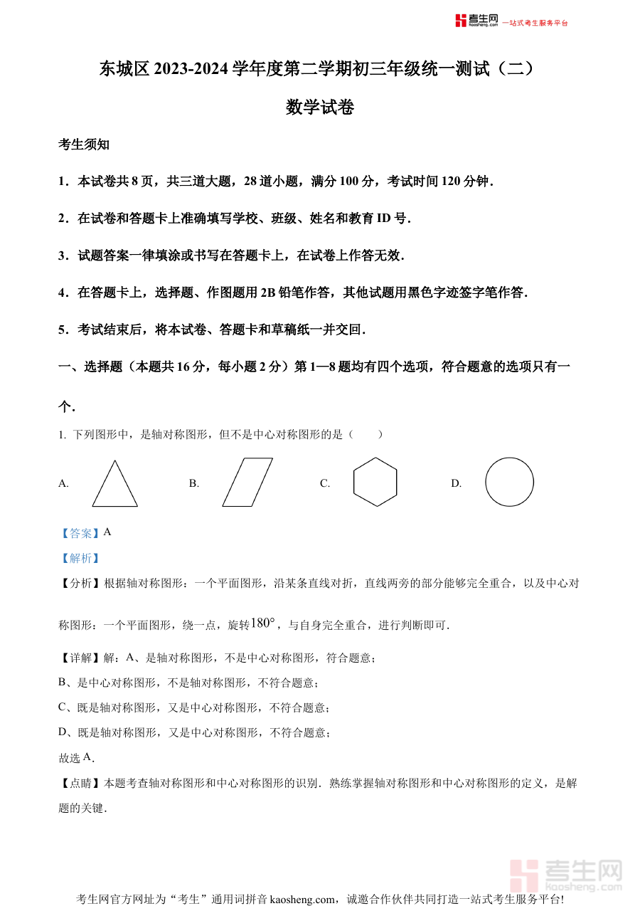 该资料主要适用于2024年北京市东城区的初三学生进行自主复习巩固、数学教师开展课堂教学与复习指导以及家长辅助孩子了解学习进度与薄弱环节等场景,其核心价值在于通过二模这一关键阶段的试题解析,帮助使用者明确中考前冲刺阶段的复习重点与方向,提升备考效率与针对性。