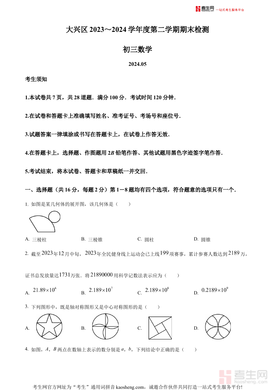 《精品解析:2024年北京市大兴区中考二模数学试题(原卷版)》是2024年北京市大兴区针对初中毕业生开展的中考第二次模拟考试的数学学科原卷类备考资料,精准匹配当地中考二模的考试属性与考查定位。该资料能够直观呈现本次模拟考试的试卷框架与考查方向,为使用者提供贴合本地中考备考需求的基础参考依据,助力备考工作的有序开展。