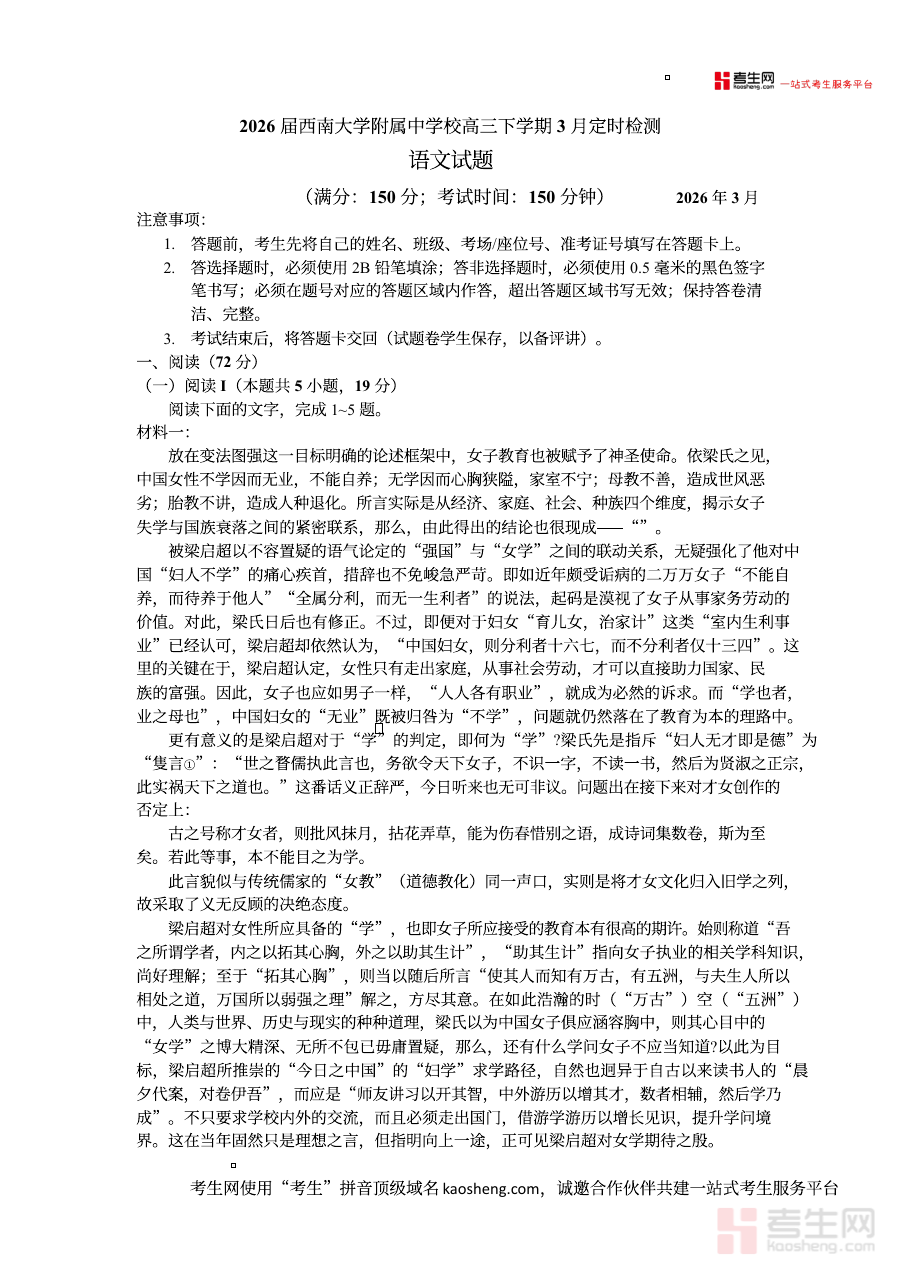 其适用人群以2026届西南大学附属中学高三学生为主,同时也适合与该校教学进度、考查要求相近的其他高中高三学生作为阶段性检测资料使用,能够帮助使用者在高三下学期3月这一重要时间节点通过规范的定时检测形式巩固语文知识体系,提升综合运用能力与应试技巧,为后续的高考冲刺积累实战经验。