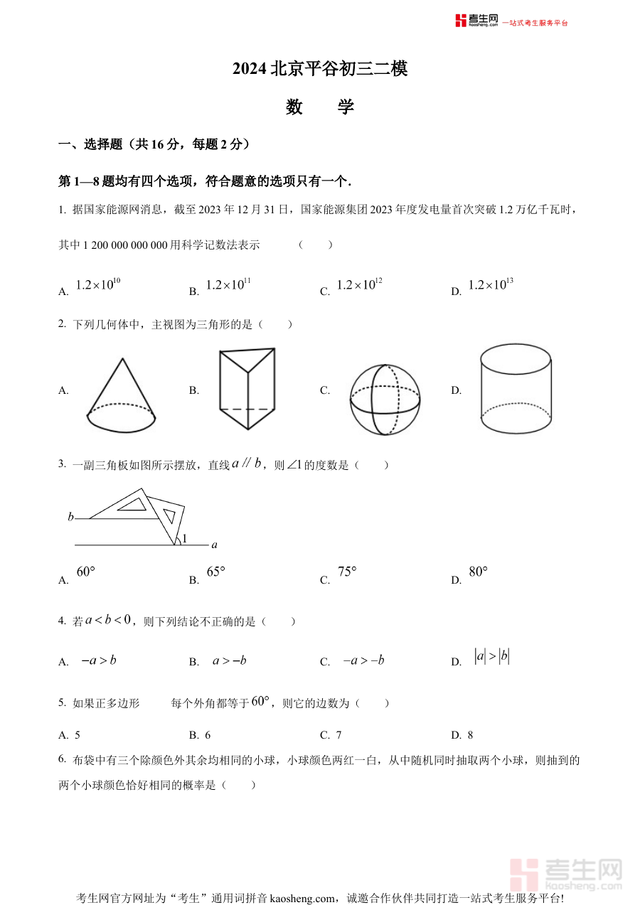 《精品解析:2024年北京市平谷区中考二模数学试题(原卷版)》是2024年北京市平谷区针对初中毕业升学考试设计的第二次模拟考试数学科目的原卷版本备考资料。该资料紧密贴合当地中考数学的命题导向与考查标准,为考生提供了与真实考试场景高度一致的练习载体,是中考复习过程中阶段性评估的重要参考材料。